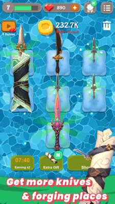 Merge knives to enhance your blacksmith's shop: Merging knives not only grants you powerful new types but also rewards you with valuable experience points for your blacksmith's shop. Level up your shop by merging, unlocking new features, and expanding your horizons.