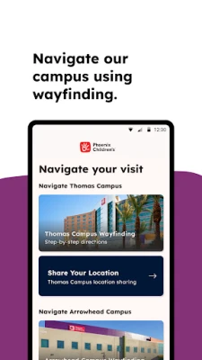 The Phoenix Children's Map app is designed to help patient families and employees navigate around our Main Campus with ease. It includes GPS wayfinding, directing you from home to the proper parking garage at our main campus on Thomas Road. Once you arrive, the app offers step-by-step directions to help you find your exact location.