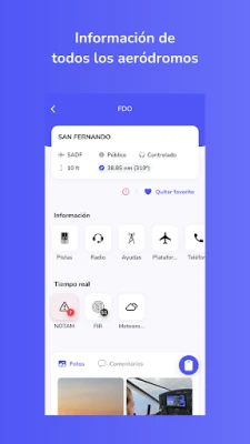 Información en tiempo real: llevá con vos información de todos los aeródromos en tiempo real, ya sea información meteorológica, avisos y posibles peligros.