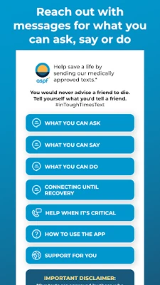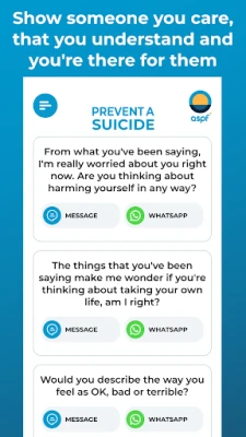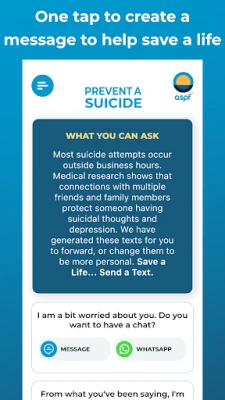 Just tapping on a message in the app transfers that text to iMessage or WhatsApp (if installed), ready to send or modify before sending. Drawing on lived experience from people who have been there, and medically approved, Prevent A Suicide: What To Say is an app designed to help you communicate with someone who may be at risk of suicide. It is based on the website https://preventasuicide.org which provides evidence-based guidance and support from survivors, supporters and experts in suicide prevention.